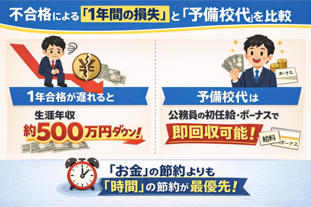 数十万円という出費は確かに痛いですが、それは「1年早く公務員になって稼ぎ始めるための投資」だと考えてみてください。
