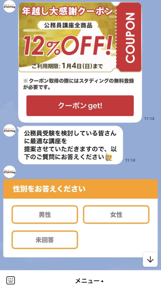 今ならLINE登録すると、公務員講座の全商品が12%OFFになります。